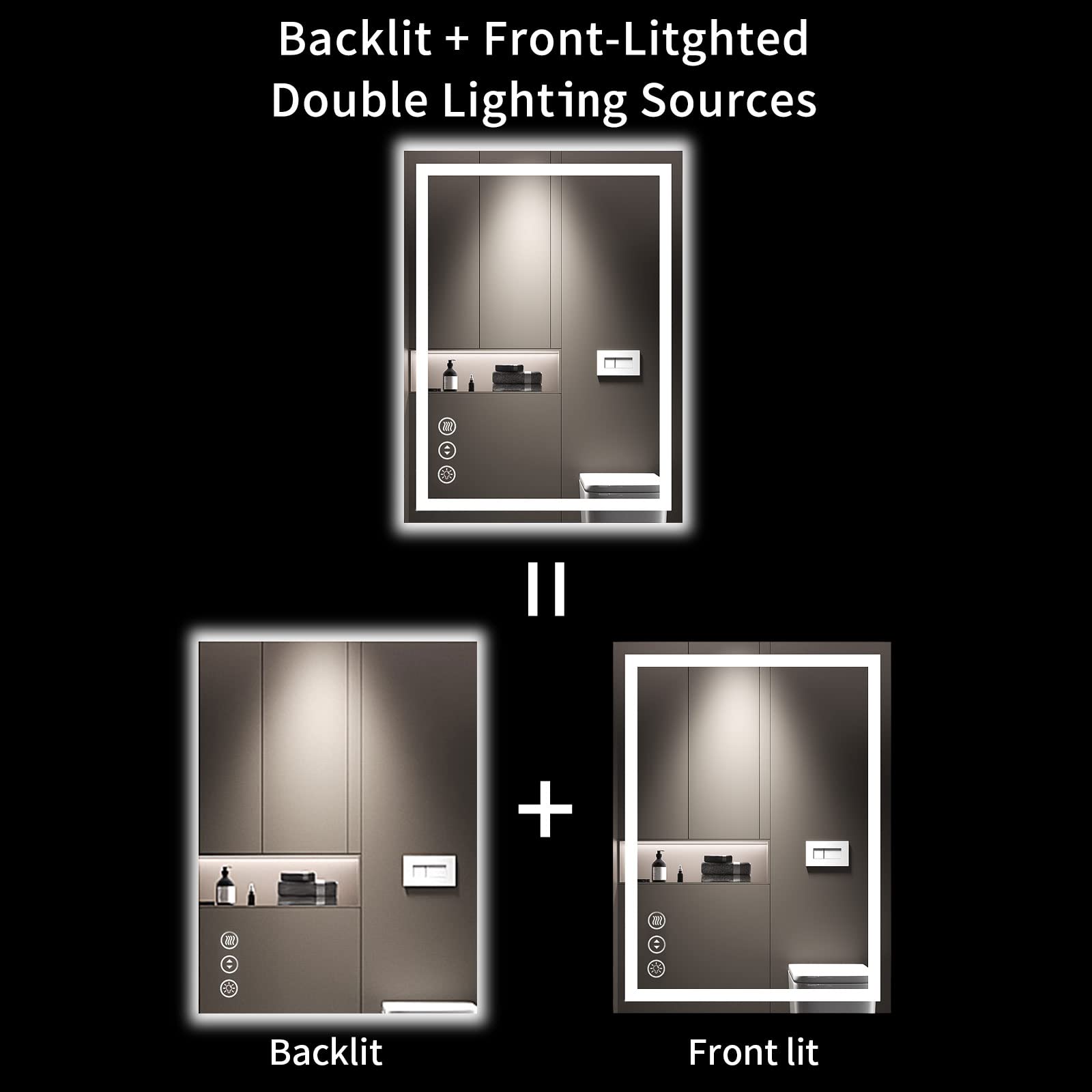 - Backlit+Front-lit, Double Lighting Sources : LOAAO LED bathroom mirror is designed with both backlight and front light. Double lighting sources designed to make the mirror bright enough for you to do makeup, skin care, shaving and dressing up. Super bright.