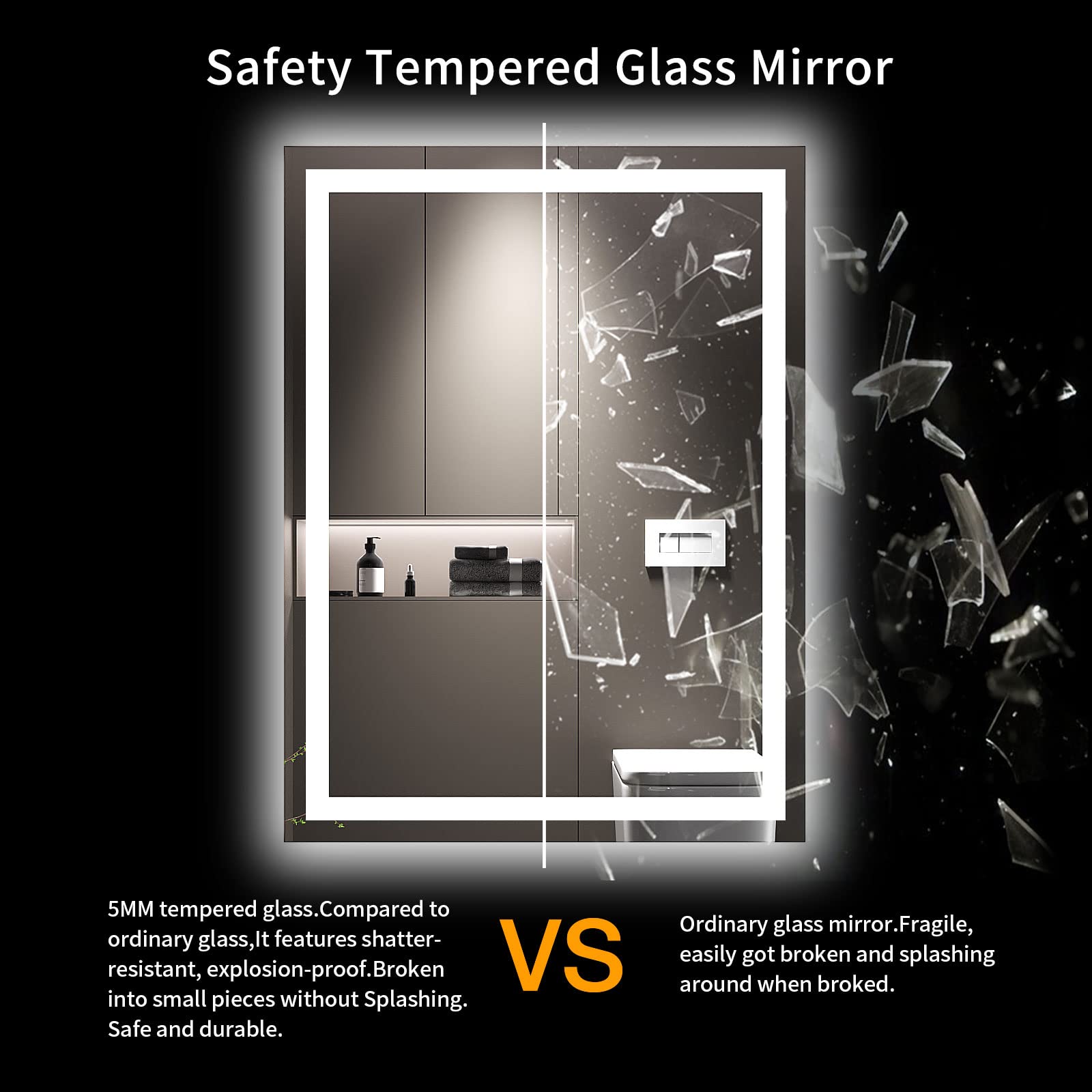 - Defog Feature & Memory Function : Fogless mirror with defog function, no worry about wiping the mirror down after a shower. The lighted bathroom mirror is already clean. Anti fog starts quick and one hour auto-off. Memory function helps remember the last setting that you’ve used, smart mirror, smart home.